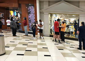 As these pictures -- taken at normally slow times in shopping malls -- show: Lines are encroaching on the common area, and there is no one enforcing social distancing. It also causes shoppers not in the line to break the six-foot distancing mandate.